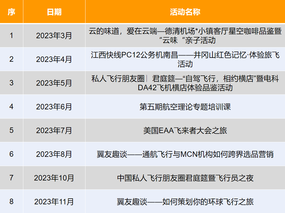 参与活动的同时,不仅可以畅聊或体验飞行生活;亦可以结交众多志趣相投的“圈友”;甚至可以“升华”事业人生!Ⅰ、星空会2023年度活动计划: