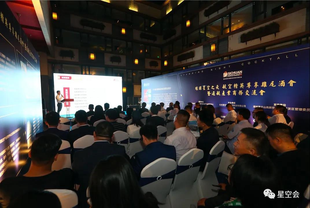 2019年9月28日晚上,作为2019四川国际航展的系列平行活动之一的“璀璨星空之夜”航空精英尊享鸡尾酒会暨通航产业商务交流会在德阳广汉新滨江酒店举行。本次活动由北京航空航天大学通用航空产业研究中心指导,北京星空天合航空科技有限公司和通航在线主办,湖州莫干山高新技术产业开发区管理委员会支持,星空会私人飞行俱乐部、上海翼趣航空咨询有限公司、北京航宇七星文化有限公司联合承办。